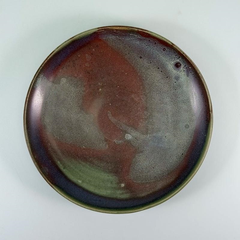 釉:通體施天藍色乳濁釉。盤面靠邊沿處有兩塊窰變紅斑,每塊面積約4×3cm。釉中有斷斷續續的「蚯蚓走泥紋」。盤背面釉很厚,有垂釉感,釉面起伏不平,但很光滑,近邊處一圈顯黑褐色,釉面有幾處小黑點。釉面棕眼,釉內氣泡稀疏、清朗、圓潤。