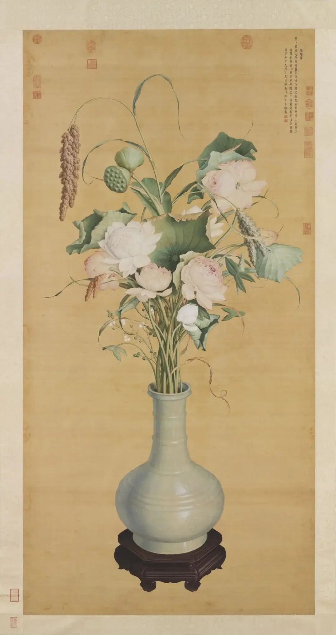 画面里,青瓷瓶静静伫立,瓶中并蒂莲或含苞或盛放,双穗粟籽粒饱满,每一抹色彩都藏着东方审美,而瓶与的高光又透着西方写实的精妙----这就是郎世宁的《聚瑞图》