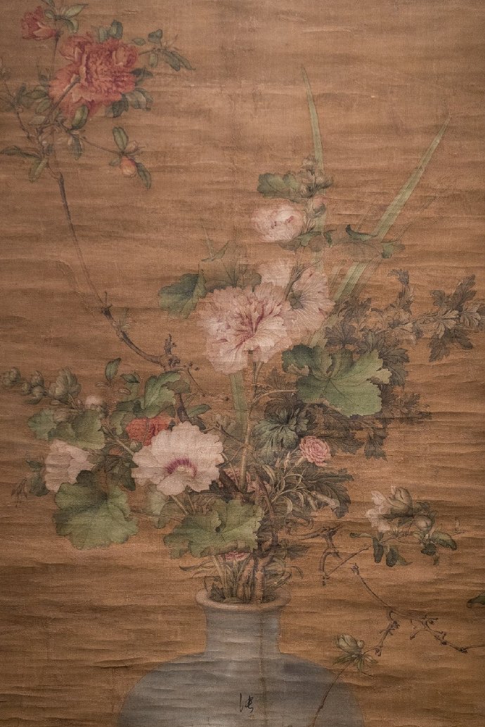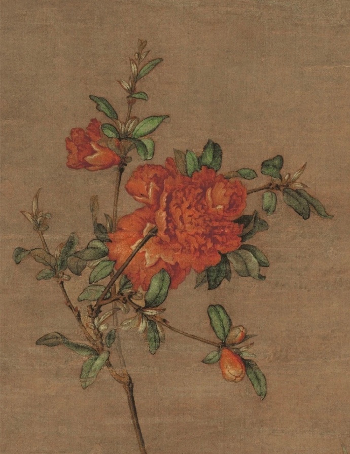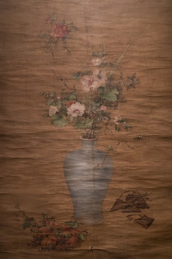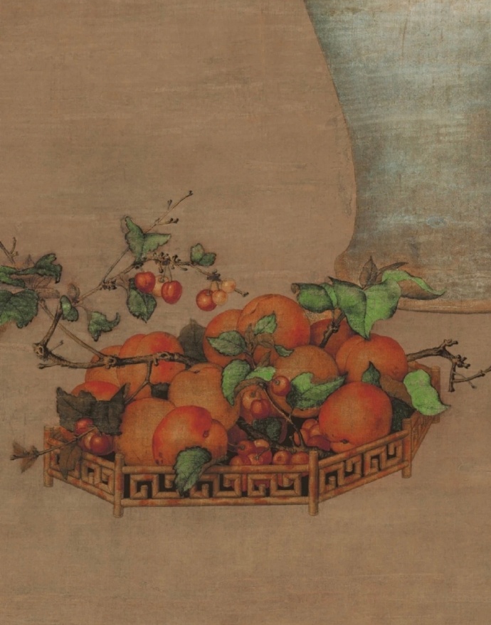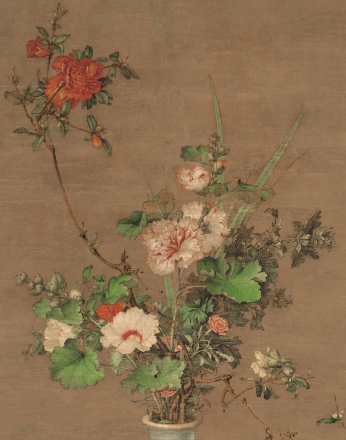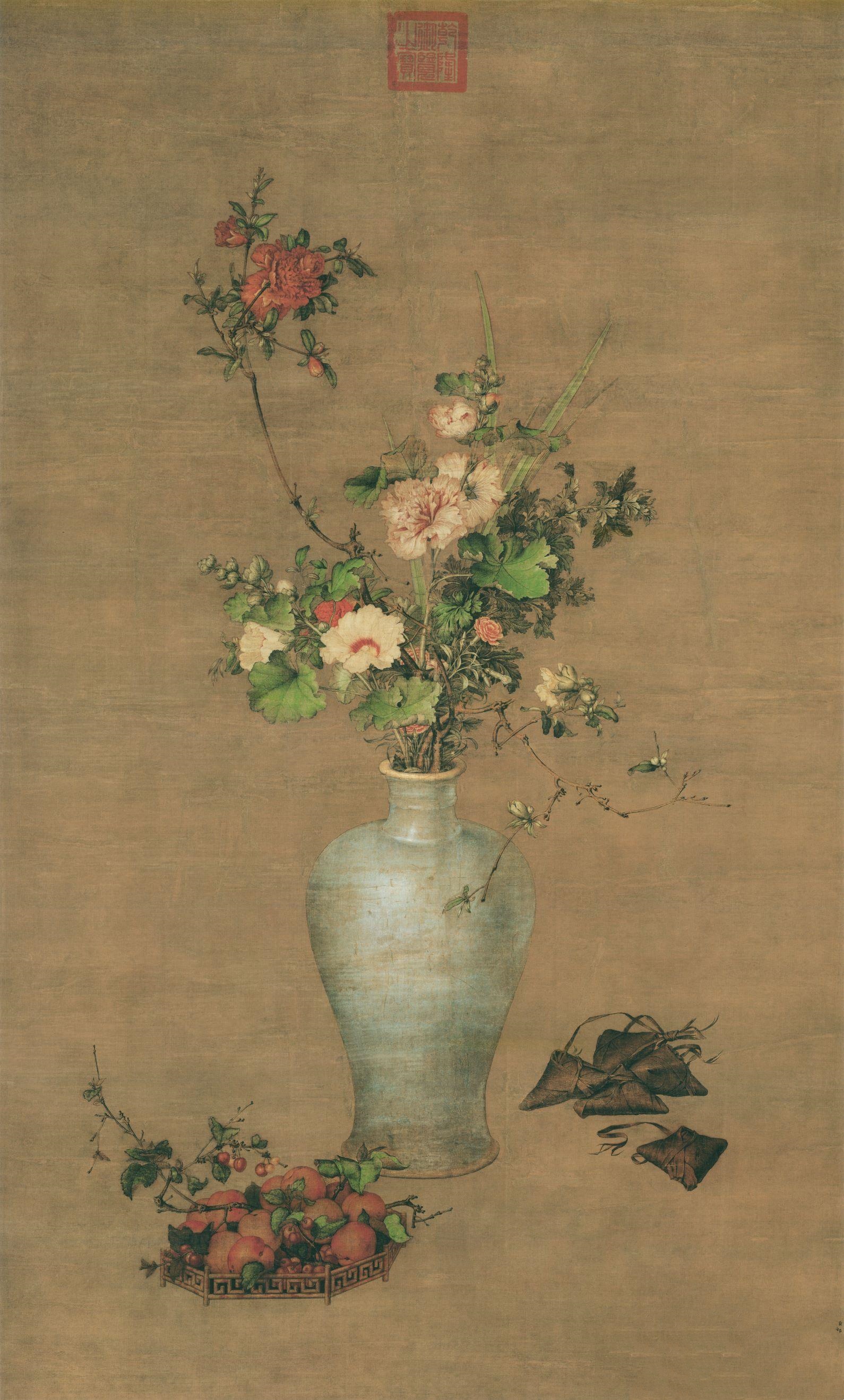 所绘清瓷高瓶中插着蒲草叶、石榴花和蜀葵花,花开鲜艳,品种繁多而不散乱;回字型托盘里盛有李子和樱桃,几个粽子散落瓷瓶的另一旁,节日气氛浓烈。 图中的粽子、蒲草等物暗示此画是为中国的传统节日——端午节而绘制的。