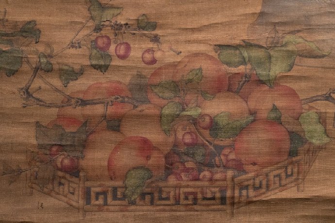 《午瑞图》是一幅近似于欧洲静物画的作品,青瓷瓶内插着蒲草叶、石榴花和蜀葵花,托盘里盛有李子和樱桃,几个粽子散落一旁。图中的粽子、蒲草等物暗示此画是为中国的传统节日——端午节而绘制的。就构图而言,画中物品聚散有致,呈正三角形布局,给人的视觉以稳定感。而绘制方法则采用色彩深浅及光影明暗的变化展示花叶、水果和瓷瓶的立体感,尤其是瓷瓶肩部见于欧洲绘画而中国画绝无的“高光”手法,能令观者清晰地体会到西方油画的技巧。虽然画面没有落年款,但根据清内务府造办处的档案记载,此图应作于雍正十年(1732年),属郎世宁在中国的早期作品。