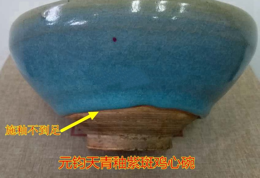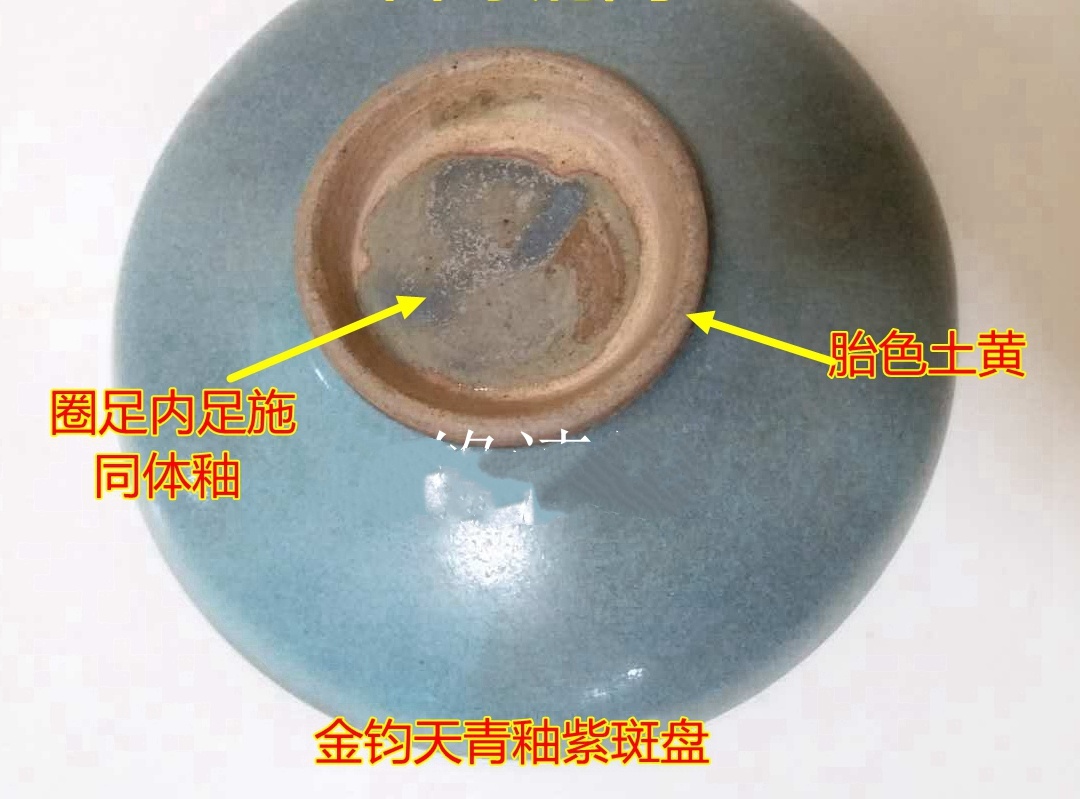 3.修足。金钧瓷底圈足平削,不见左右开弓之斜削,有的底足还出现黏砂;圈足同北宋钧民窑基本一样,使用浅色护胎釉,圈足内施加同体釉。