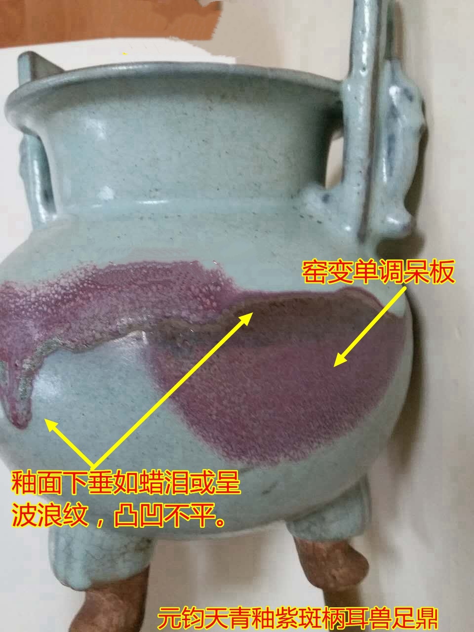 宋钧与仿品的区别,关键点一是釉料为矿料、玛瑙,釉里有金点和小颗粒。二是柴窑烧,而不是煤窑、气窑。柴窑烧,流纹、卷云纹有立体感,不可仿,成本高的吓人。煤窑烧的,火急火大,釉面流动性强而流纹僵硬,气泡小,呈橘皮面。气窑时间更短,无气泡,呈平面。