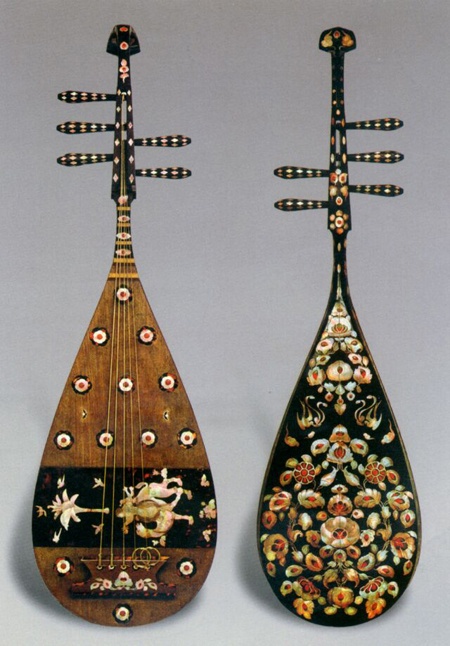 螺钿紫檀五弦琵琶 唐 长108.1cm 最大腹宽30.7cm 日本奈良正仓院藏 系南北朝时自西域传入中原,至隋