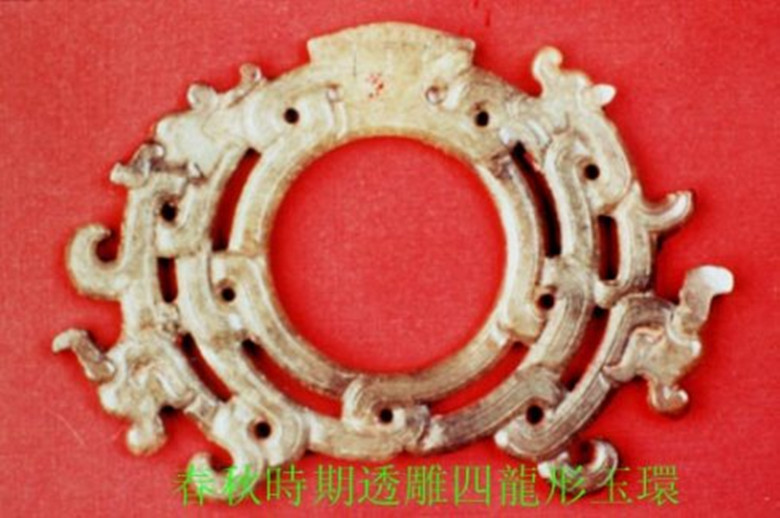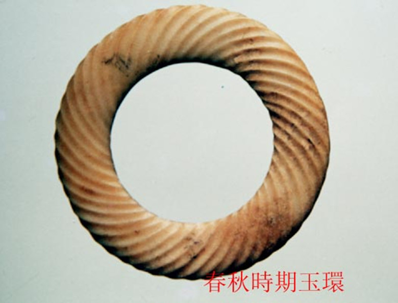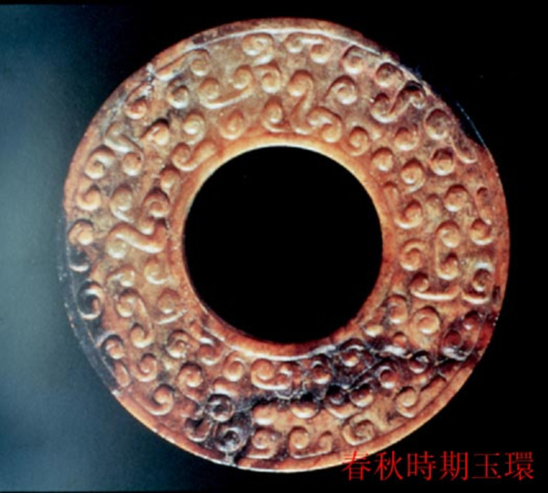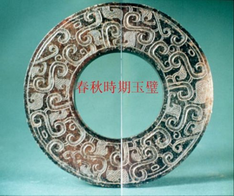 春秋时期的玉璧,既不同于良渚文化的素面玉璧,又不同于战国时的大形饰文玉璧,而是一种小型系璧,直径5厘米左右,大多边出细廓,两面饰纹。此种玉璧不是祭天之器,而是佩带用器。