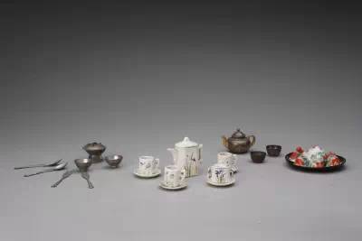 小瓷茶具、成套小银酒具、锡制小火锅、小碗