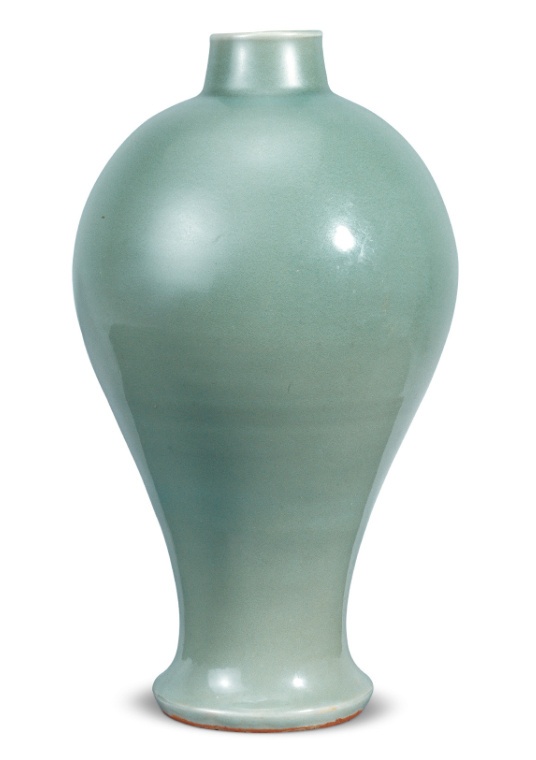 小圆口,短直颈,溜肩,高束腰,撇足,足沿显露火石红胎。通体施纯正的梅子青釉,青翠欲滴,光洁似玉。形完、器美、釉色一流如此瓶者十分稀少。
