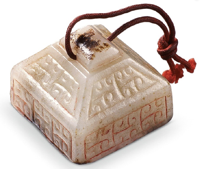 官印。印面阴刻田字形界格内篆书“公孙穀印”,每格一字,覆斗形钮,坡面和印侧阴刻卷云纹,秦篆,线条细腻柔丽,秀劲绝伦,充分显示出秦印文字之俊美。玉质温润,在秦印中稀少珍贵。春秋战国时期各国诸侯,多被称为“公”者。国君由嫡长子继位,即位前称太子,其他儿子称公子,公子的儿子称公孙。公孙的后裔子孙中,有人以身份称谓“公孙”为姓氏者,称公孙氏。公孙并非
