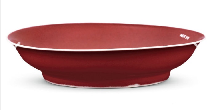 侈口,弧腹,圈足。除外底外,通体施红釉,釉色凝重静穆。外底施白釉,底心青花书“大明宣德年制”双圈楷书款。明代早期红釉瓷作皇室祭祀之用,故红釉又名祭红釉。祭红釉创烧于永乐、宣德年间,是名贵的单色釉品种。其以铜为着色剂,在还原气氛中烧制而成。永宣祭红器口沿往往显出一圈白线,俗称“灯草口”或“灯草边”。明初红釉烧制技术高超,釉色匀净,宝光灼烁,表明景德镇御窑对颜色釉瓷的烧制已达到炉火纯青的地步。