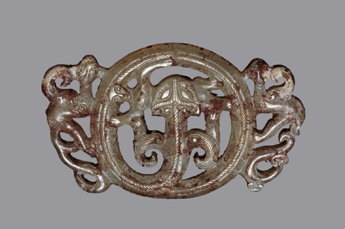 佩中部镂雕螭虎噬人的图案,环佩两旁刻有人首翼兽。螭虎,虎首蛇身,盘曲伏卧,是龙虎结合的神兽形象。商代晚期的青铜器上也可见类似的虎食人形象,被食之人神态安详。一般认为此类题材可能与逝者化神的内容有关,是表现战国时期祭俗文化和仙化升天思想的珍贵实物。