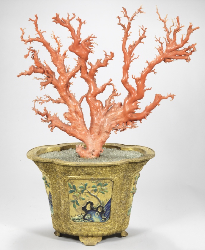 铜镀金盆红珊瑚盆景,清代宫廷陈设艺术品。以铜胎镀金制成盆座,工艺精湛,纹饰华丽,彰显皇家气派。盆中安置整枝或拼接的红珊瑚,枝干自然舒展,色泽艳丽,与镀金底座相映成辉。此类盆景寓意吉祥、长寿与富贵,常陈设于宫廷殿堂、寝宫或节庆场合,既为观赏佳品,也体现皇室的财富与审美追求。