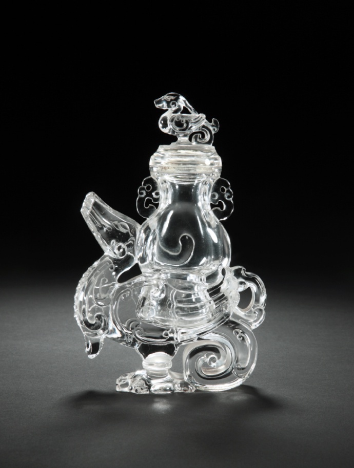 通体以天然水晶雕刻,造型为昂首展翅的神禽“天鸡”,象征吉祥驱邪。晶莹剔透,工艺精湛,体现清代宫廷对珍贵材料与瑞兽文化的结合与崇尚。