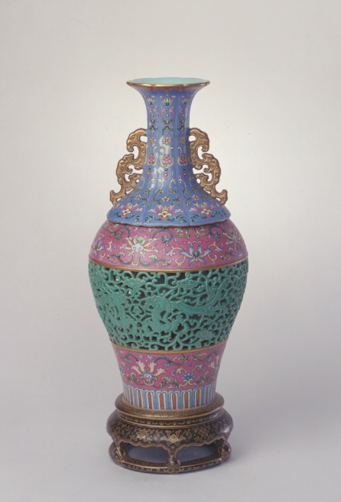 乾隆款洋彩镂空龙纹夔凤耳转心瓶(清乾隆,故00154595),瓶身结构复杂,内外双层,外瓶镂空雕龙纹,颈部饰夔凤耳,可转动内瓶。通体施洋彩,色彩艳丽,工艺精湛,体现乾隆时期御窑瓷器的技术高峰与装饰华美。