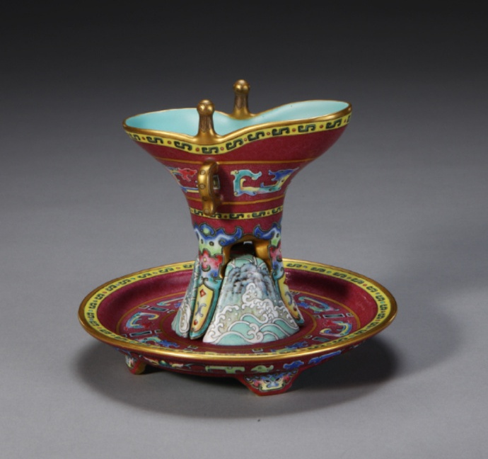 乾隆款胭脂紫地轧道洋彩描金带托爵(清乾隆,故00152673),仿古代青铜爵形,配带托盘,庄重典雅。通体施胭脂紫釉,运用轧道工艺刻划锦纹,并以洋彩描金装饰夔龙、花卉等图案,色彩华丽,工艺繁复。此器体现乾隆时期中西融合、尊古创新的皇家审美与御窑工艺水平。