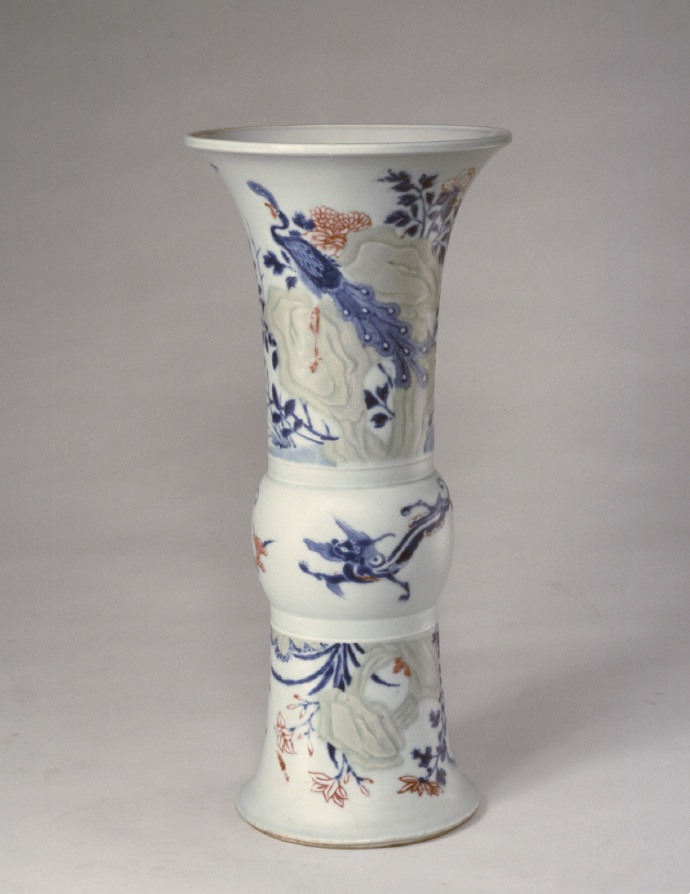 青花釉里红丹凤朝阳图花觚(清康熙,故00148355),为康熙朝景德镇官窑及民窑常见的花觚造型器物。器形分为“撇口、长颈、鼓腹、两层台圈足”,因口沿外撇似凤尾,亦称“凤尾尊”。