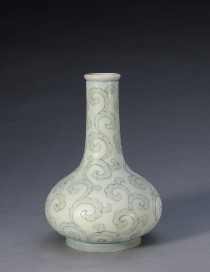 此瓶直口、长颈、丰肩、腹圆、圈足,比例协调,器形挺拔秀美。通体施釉洁白细润,器身以斗彩工艺装饰缠绕流畅的卷枝花卉纹,釉下青花勾勒主线,色彩淡雅,层次清晰,充满文人气息。