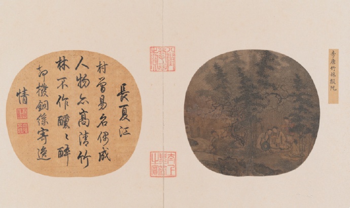 《四朝选藻亨册》宋人〈竹林拨阮〉页,宋代绘画册页,选自《四朝选藻亨册》系列。此页描绘一高士于竹林中抚阮独坐,环境清幽,意境高远,体现文人寄情山水、追求隐逸生活的精神境界。笔墨潇洒,人物神态自然,展现宋代人物画细腻生动的艺术风格与文人画的审美取向。