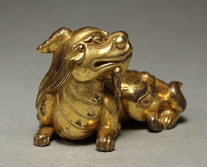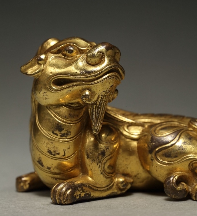 铜鎏金卧兽,通体鎏金,首似狮形,双目圆睁,凝视前方,两眉突起,并饰双角向后延伸,伏地匍匐,兽首回转,下颌前伸,尾卷曲服贴后侧,背脊隆起,两侧雕琢双翼。先民塑造神兽灵物,意在辟邪降福。