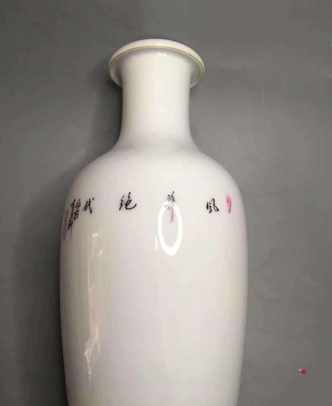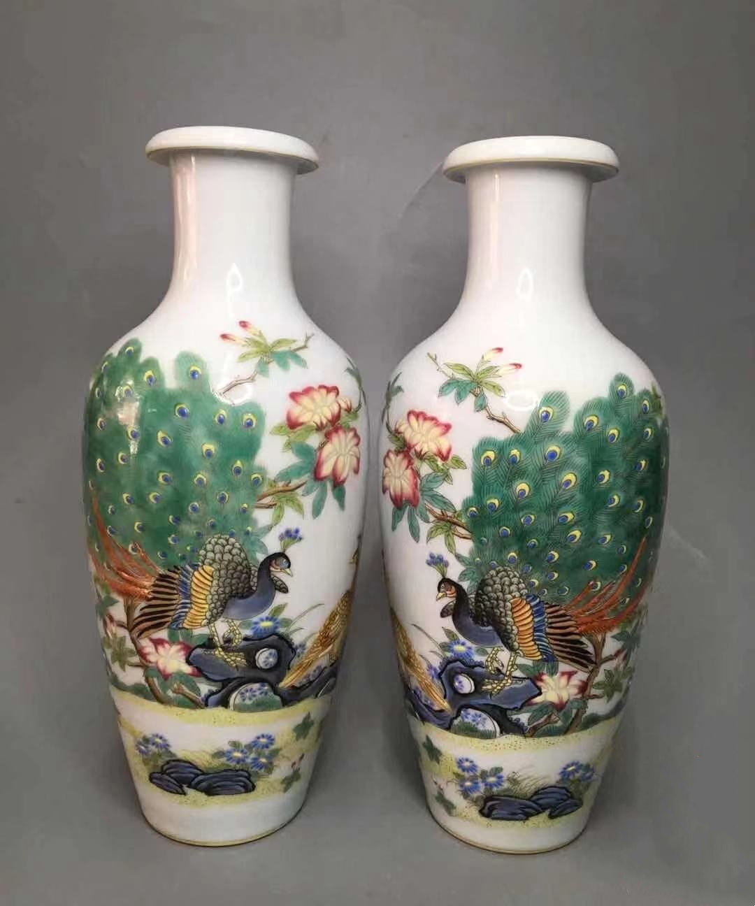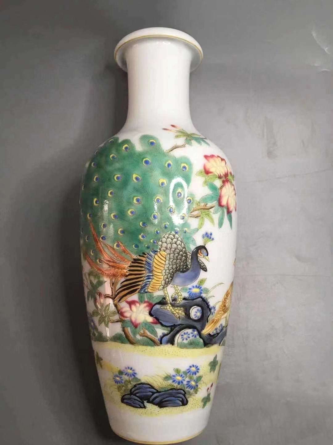 此对瓶的画工,到了令人惊叹的地步:孔雀开屏,层次分明,前后错落有致,花朵各异,瓣瓣有变化,其精美令人喜欢。