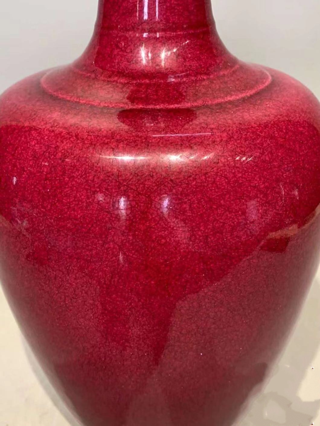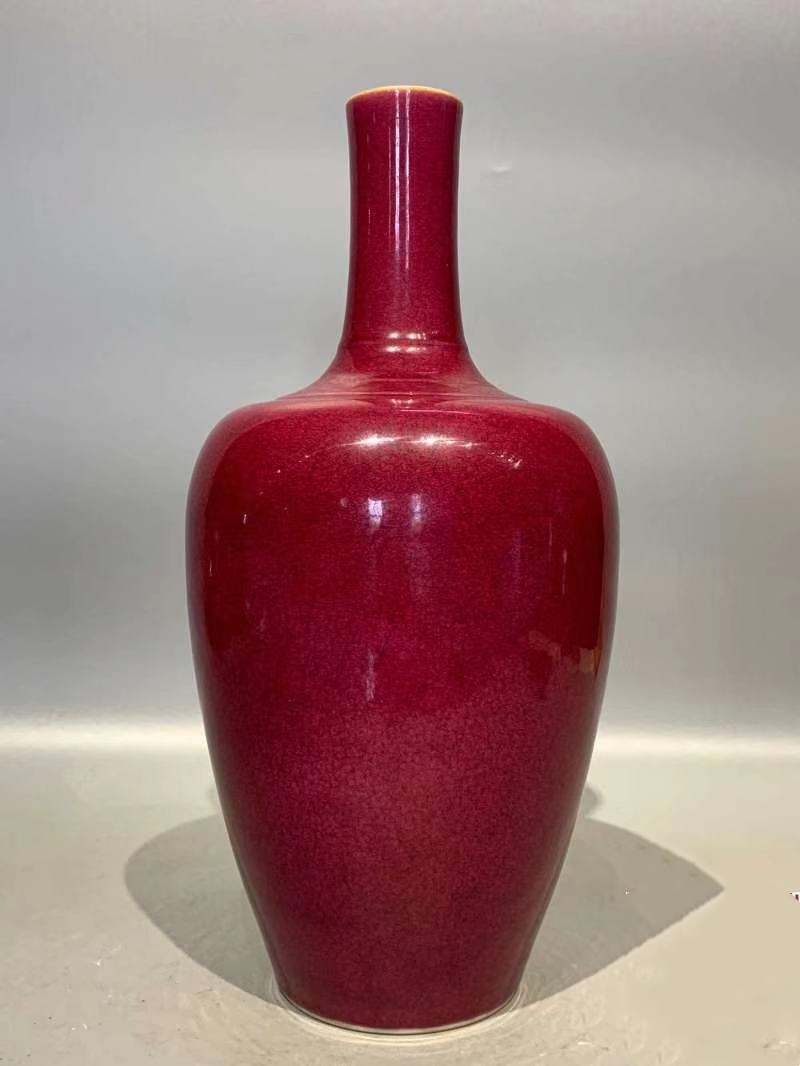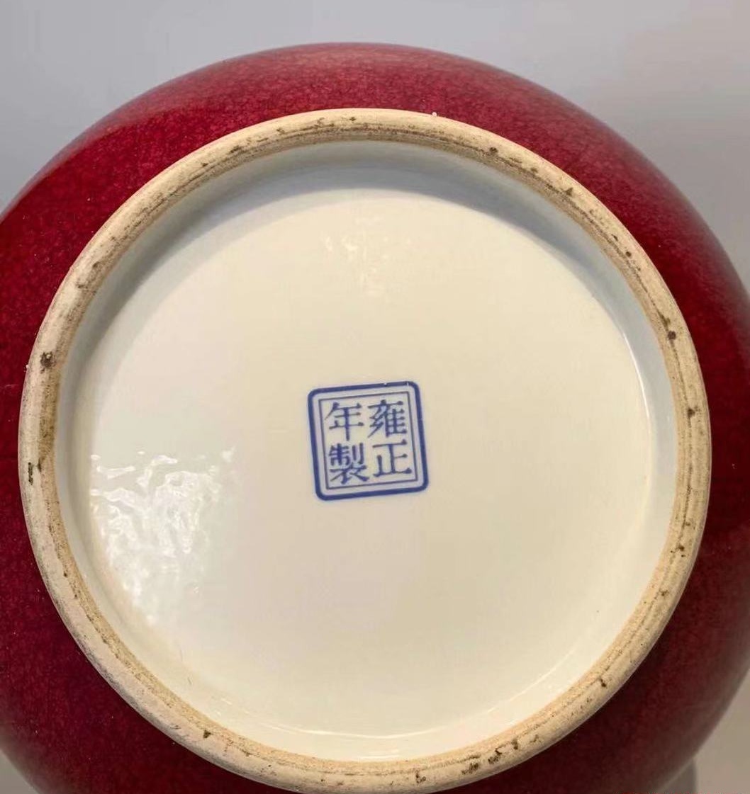 宝石红釉,因受窯内气氛影响较大,烧造出颜色纯正均匀者极为难得,宝石红釉品种中祇有少部分釉色可以称之为宝石红釉,自明初永乐年间创烧成功始,其後各朝无不以此为衡量製瓷水平的标准,清雍正官窯在严格的制度下,烧造技术成熟为同一时期之佳作。