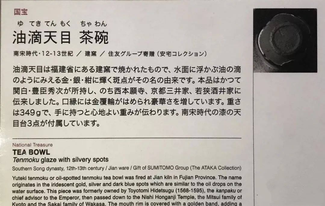 大阪市立东洋陶瓷美术馆设立于1982年,收藏有几千件精美绝伦的中国及韩国古代陶瓷艺术珍品。藏品以“安宅收藏”及各方面的捐赠为主体,其中包括国宝两件及十三件重要文化财。中国陶瓷室部分藏品量虽不大,但其中包括多个历史时期陶瓷精品以及代表作品,其中就包括收藏界追捧的宋代建盏极品“油滴天目”。此盏曾为丰臣秀吉所拥有,后经本愿寺、京都三井家族和若狭酒井家族辗转流传至今。馆内环境舒适典雅,是宋瓷爱好者不容错过的绝佳去处。