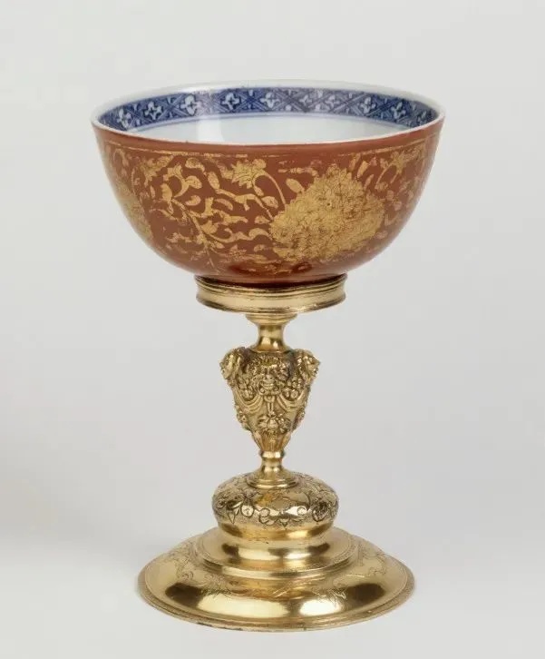 明嘉靖 青花矾红描金缠枝莲纹碗 镶嵌鎏金银座