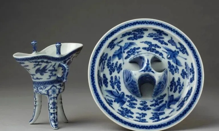 ▼清乾隆 青花云鹤纹爵、盘