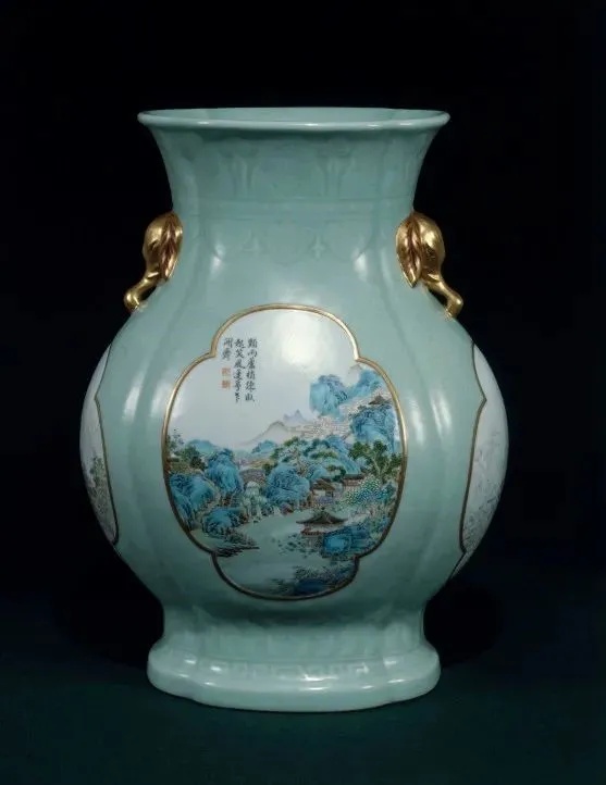 ▼清乾隆 粉青釉开光山水象耳尊