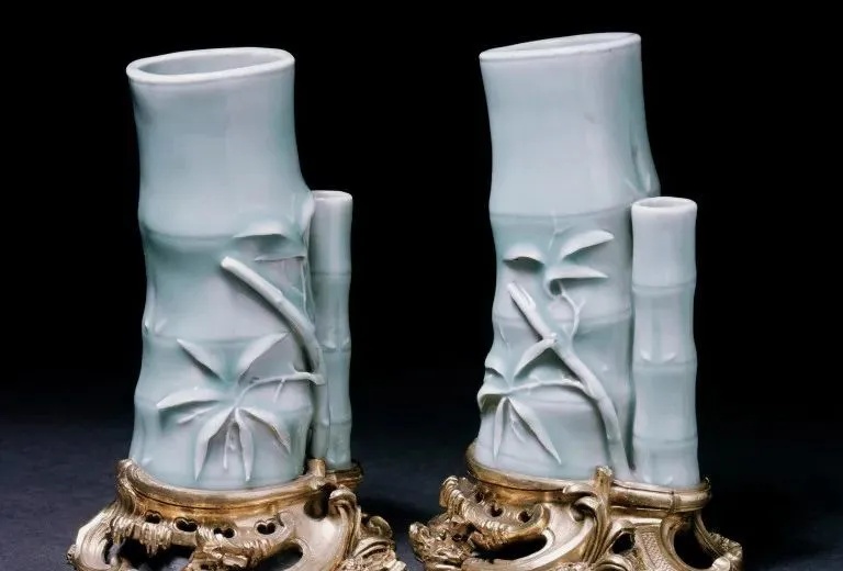 ▼清乾隆 粉青釉雕花竹节式笔筒(一对)