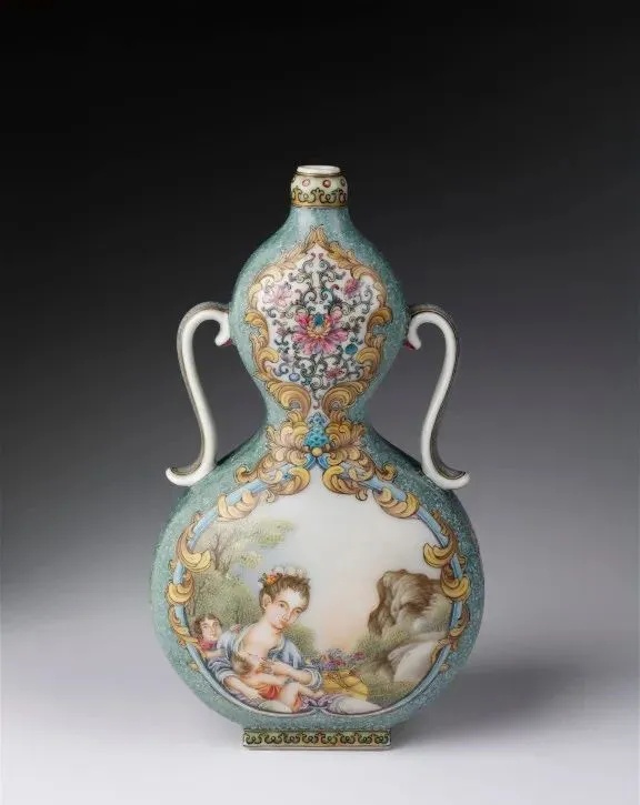▼清乾隆 珐琅彩开光人物双耳葫芦瓶