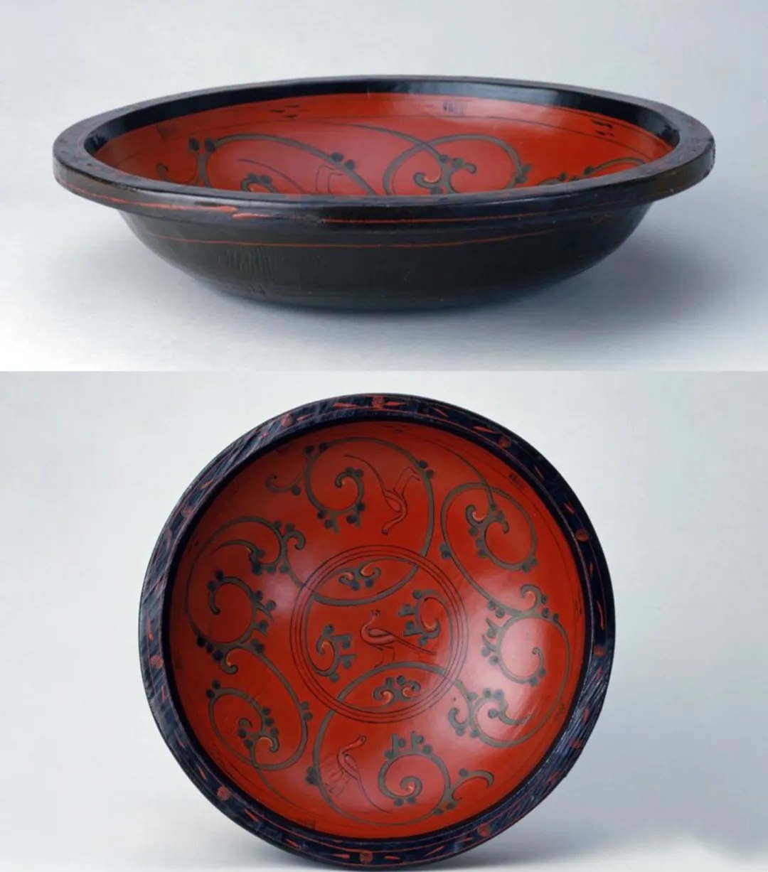 ▲西汉 彩绘漆龙鸟纹圆盘 北京故宫博物院藏