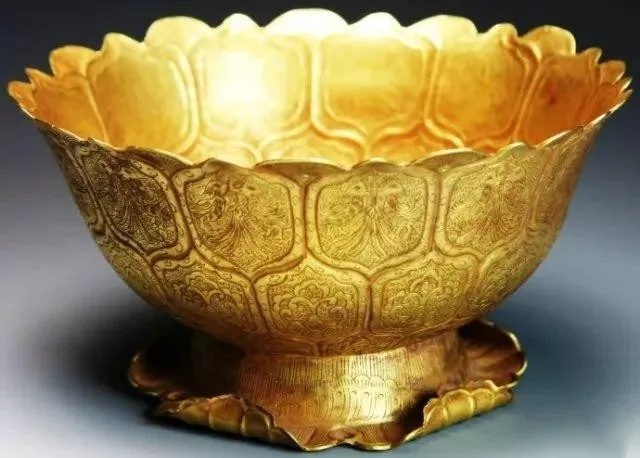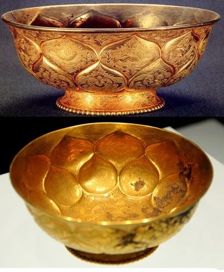 ▲唐 鸳鸯莲瓣纹金碗 西安何家村出土 现藏于陕西历史博物馆