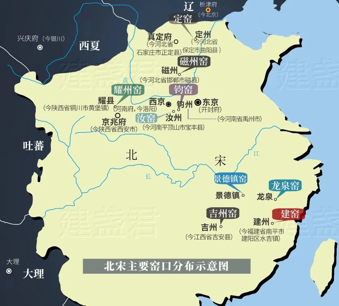 其中闻名后世的几大重要窑口,分布示意图如下,南北皆有。