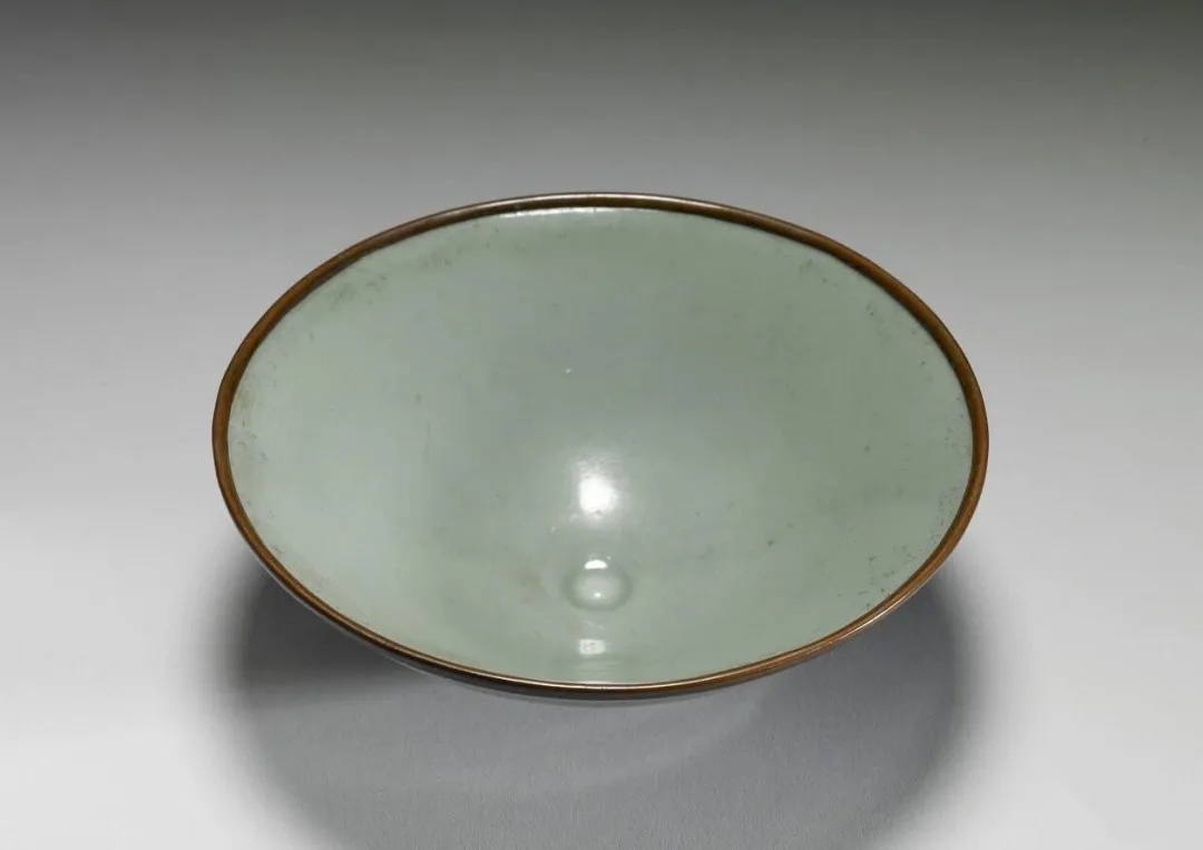 ▲本器为宽侈口的斗笠式茶盏,口沿嵌有金属釦;内外均施青釉,浓润明净。
