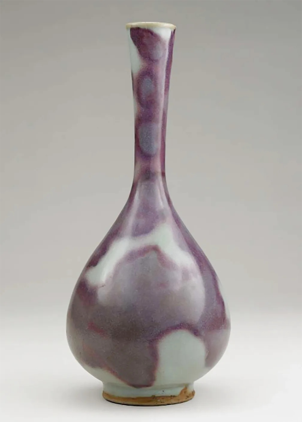 尺寸:高26.4cm 口径7.8cm 虽宋代龙泉窑所烧造的琮式瓶是历代琮式瓶的典范,一色清纯的端正韵味审美,不同窑口、不同时代的琮式瓶也是别有滋味。 胆式瓶 胆式瓶,器型如悬胆,自宋代开始广泛流传的器物。因其造型典雅、线条简练俊朗、鼓腹容水、修颈束枝,成为宋代及以后达官贵族、文人的书室妙品,用以焚香、插花等。 ▼北宋 汝窑青瓷胆瓶 台北故宫博物院藏 尺寸:高17.8cm 口径3.6cm 足径8.4cm< 时至今日,它依旧是中国古代陶瓷造型中的经典器型,属于较小器型,尺寸高度几乎不超过30厘米,极少放置在地板上作装饰,通常放置案面。 宋人对胆式瓶颇多偏爱,各类诗词闲赋里都能看见“胆瓶”的身影。如: 宋王十朋(1112年-1171年):“胆瓶相对数点雪,锦肠写出飘然才”;南宋韩淲(1159年-1224年):“雪后月华明,胆瓶无限清。 ▼宋 哥窑胆式瓶 故宫博物院藏 尺寸:高14.2cm 口径2.2cm 足径5.4cm ▼北宋 钧窑蓝釉紫斑胆瓶 大英博物馆藏