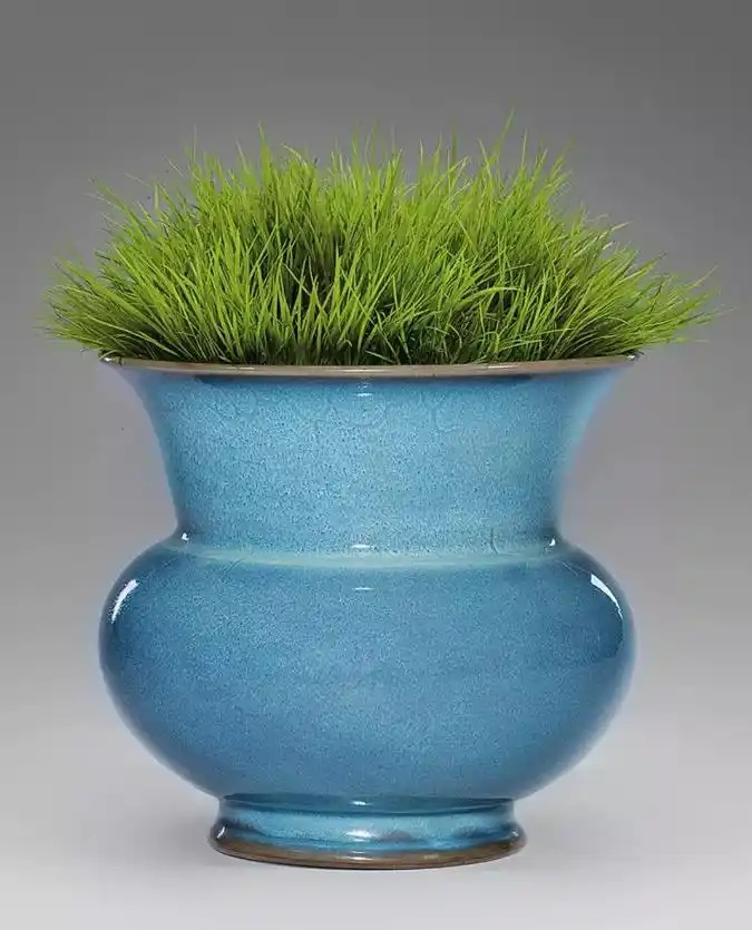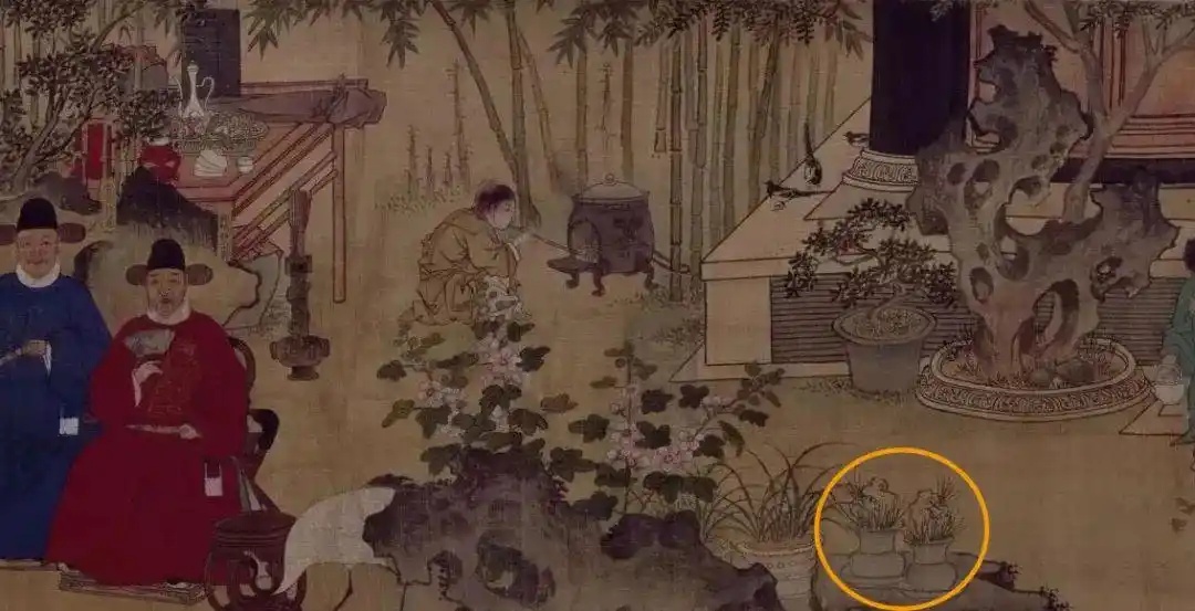 那时钧窑花盆、盆托、出戟尊等花器“贡御”经常被来点缀御花园以及皇家园林,丰富皇家生活。据载,至迟在明代早中期,在宫廷用钧瓷花器,盆托来种植菖蒲。《竹园寿集图》中,就可见到种植着菖蒲的钧窑花盆的例子。