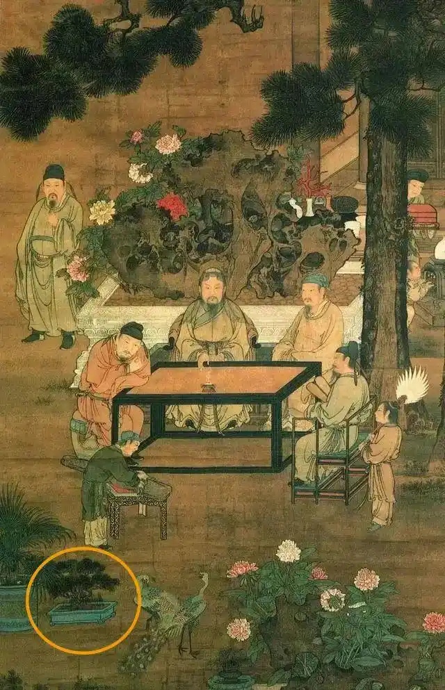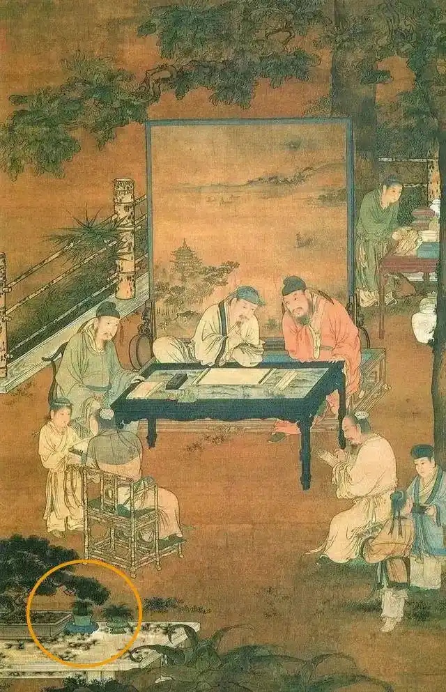 在《明人十八学士图》里,有种植松柏的钧窑天青釉花盆的身影。