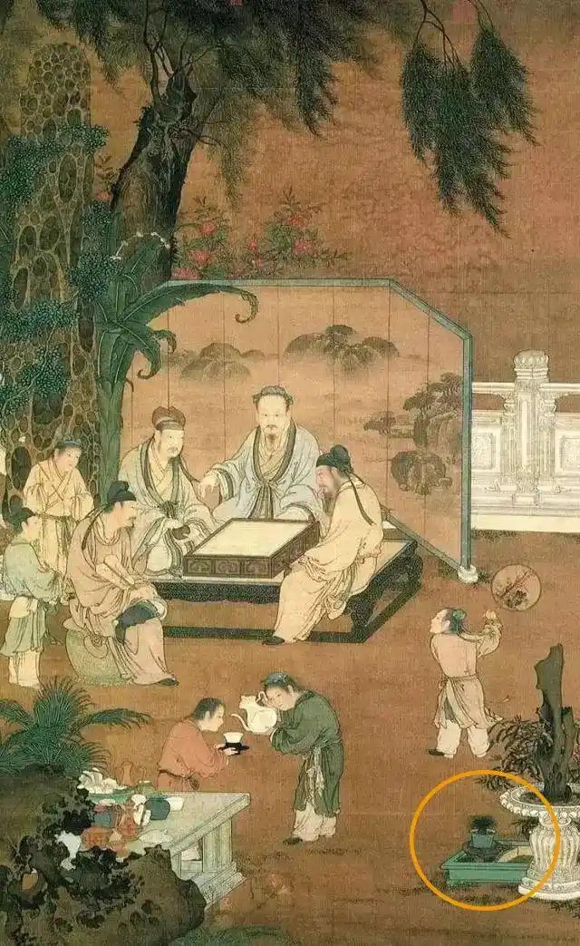钧窑鼓钉三足花盆托也时而出现画中,明《五同会图》 绢本设色,明万历《琵琶记》残本,仔细观察,就会发现其身影。