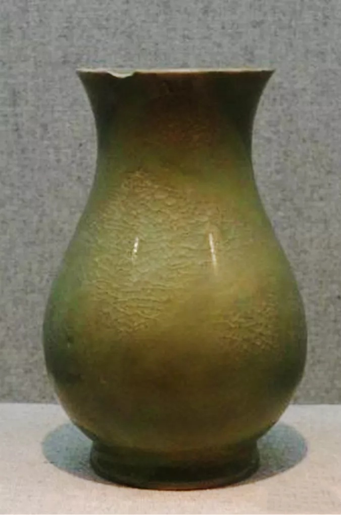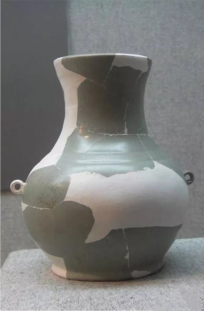 汝窑仿汉壶也不见传世品。此件出自汝窑窑址,仿汉代铜壶造型,盘口、短粗颈、溜肩、鼓腹,于腹左右两侧各置一穿耳,腹下渐收,圈足(图5-4)。