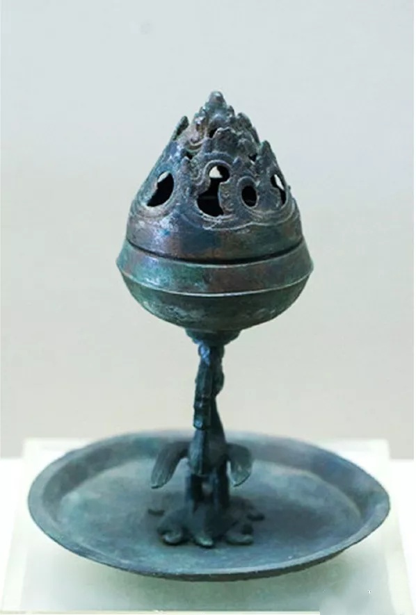 汉代张骞通西域以来,随着西方名贵香料不断输入,用香炉燃香以熏居室及衣物的习俗渐盛,可从内蒙古博物馆所藏汉代青铜博山炉、河南省南阳市出土的汉代青铜鸭形香熏中得到印证(图6-1、6-2)。