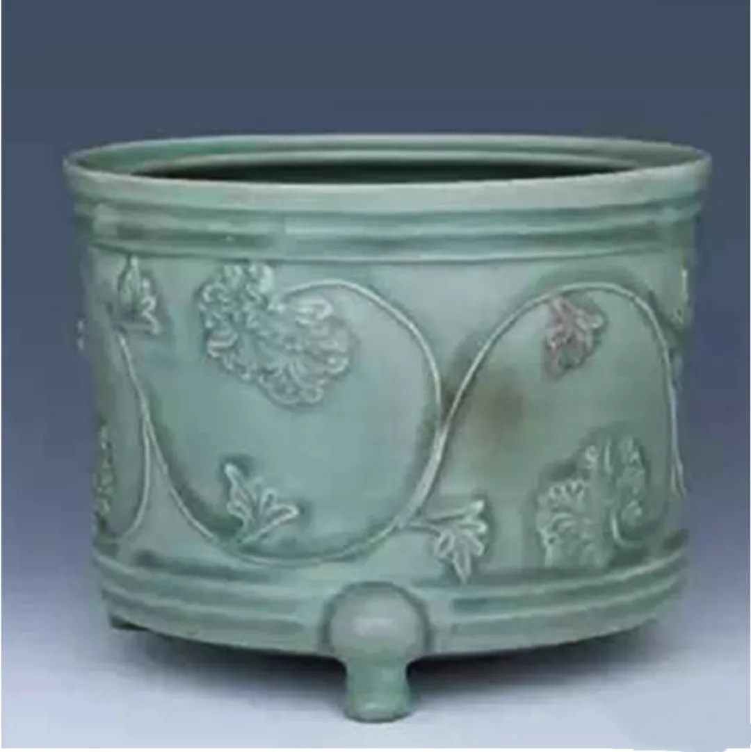 图12 南宋龙泉窑青釉贴塑缠枝菊纹奁式炉,绍兴市钱清镇环翠塔地宫出土