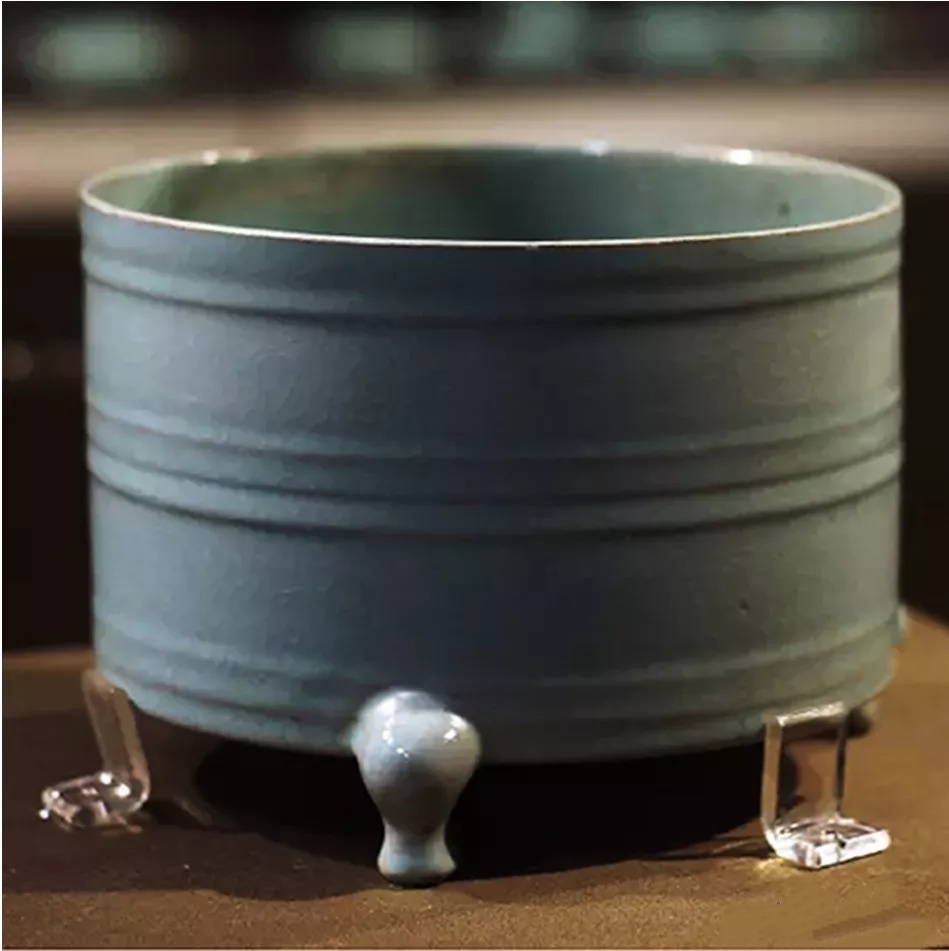 图14-2 南宋官窑青釉凸弦纹奁式炉,南宋官窑博物馆藏