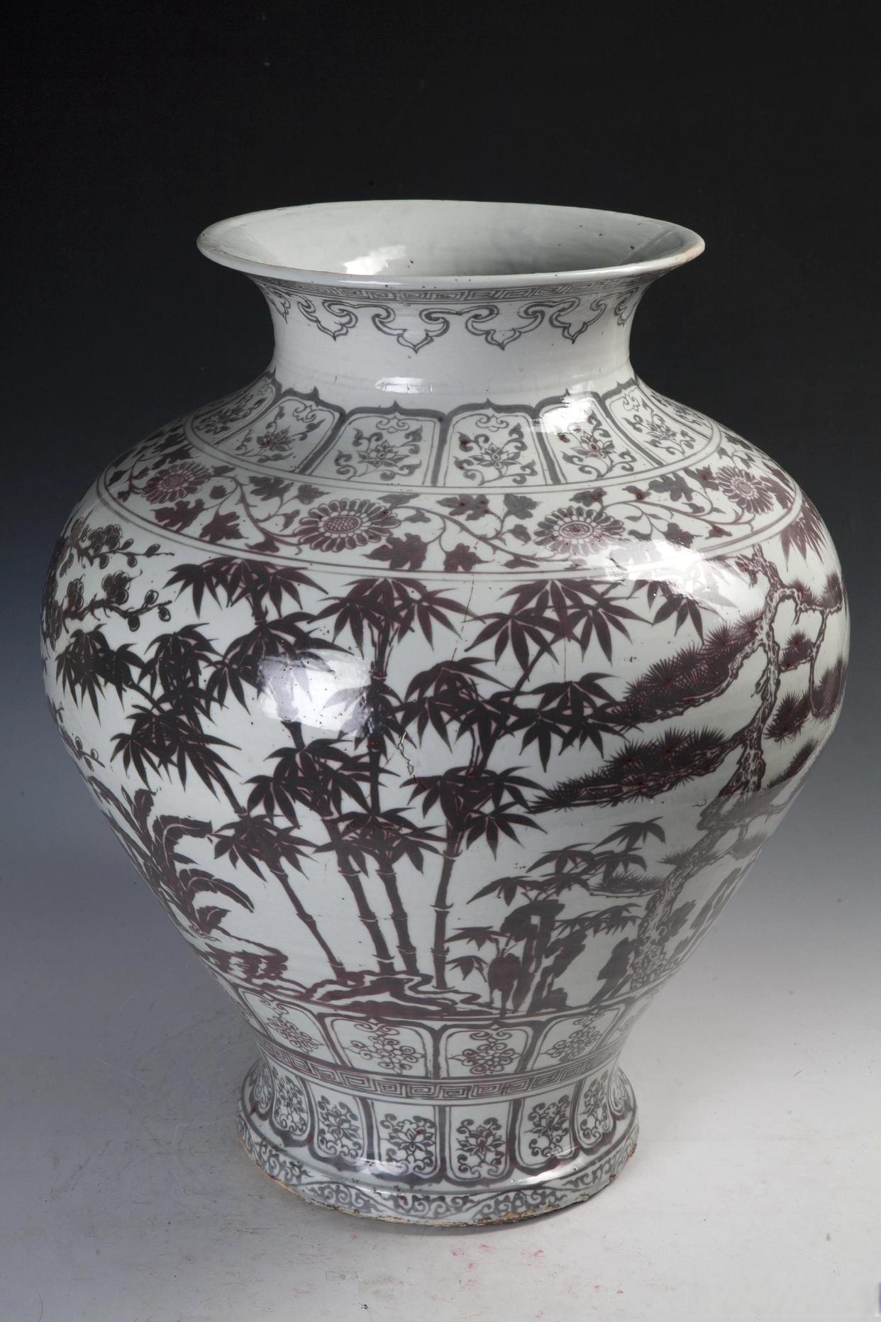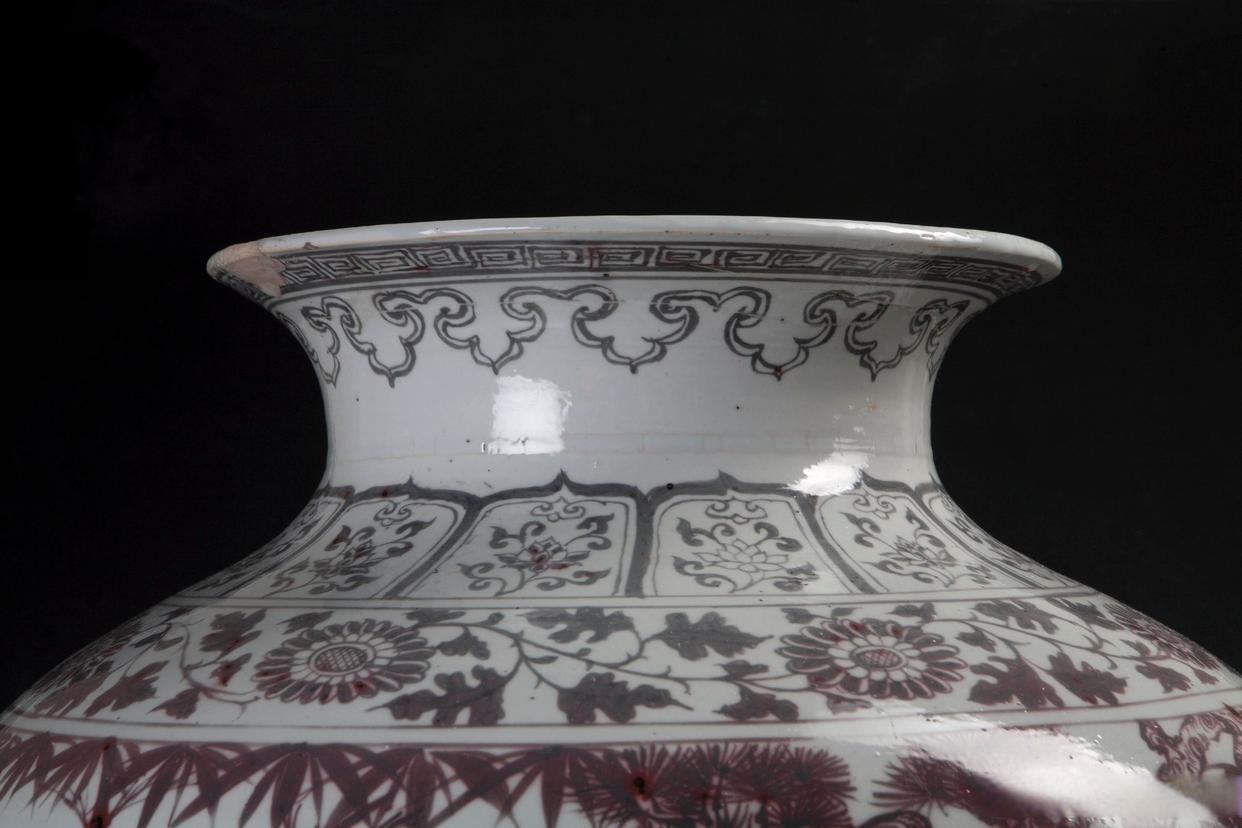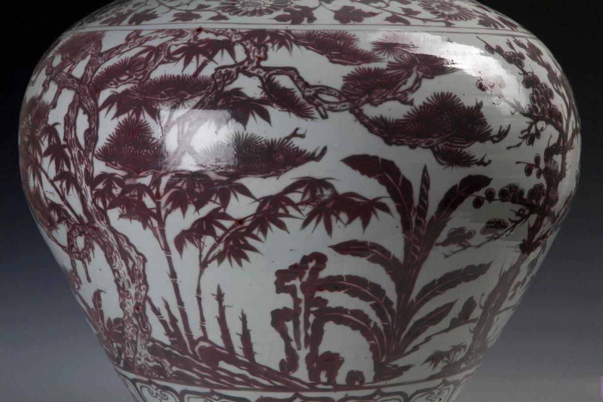 釉里红创烧于元代景德镇窑,成熟并盛行于明代洪武时期。这件釉里红松竹梅纹罐,器型硕大规整,胎体厚重,釉质肥厚,呈青白色。口沿处绘制如意云纹,颈部为变体莲辦纹,肩部装饰缠枝扁菊花纹,腹部主题纹饰为松竹、梅“岁寒三友图”,并配有蕉叶和坡石作为讨托。器物腹下部绘有两组莲花瓣纹,间隔处绘制回纹,圈足边沿装饰卷草纹,画面层次多达八层,但主题突出,主次纹饰鲜明,繁而不乱,承袭了元代的绘画风格,展现出多层次彩绘的独特风貌。