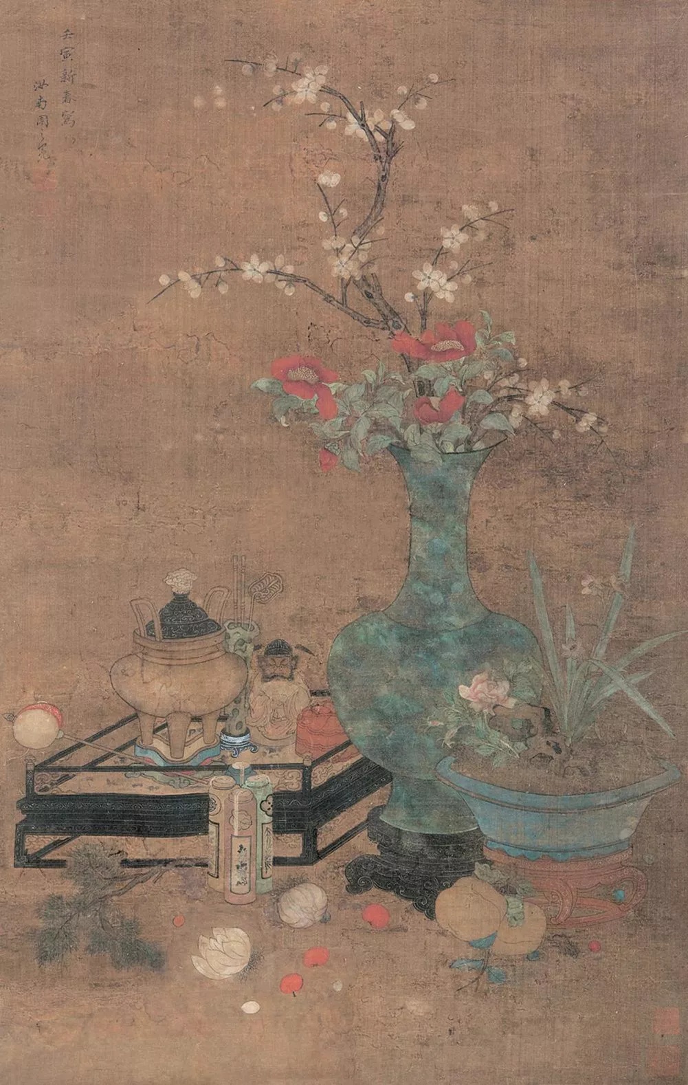 ▲[元代]錢選《歲朝清供圖》,絹本設色,95×61cm。私人藏品。