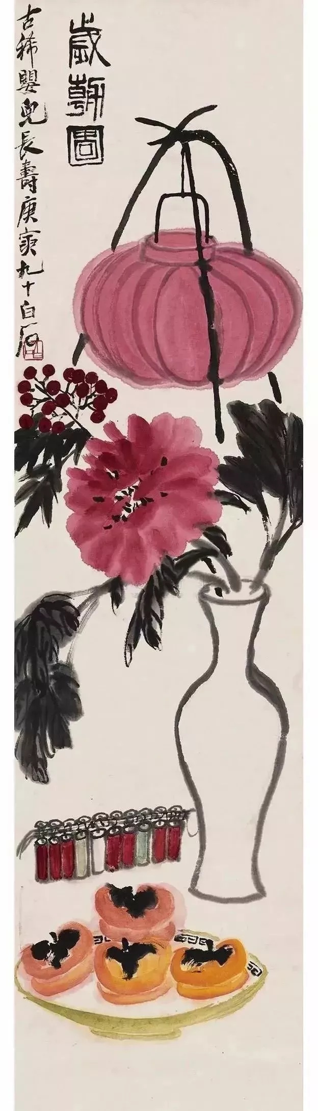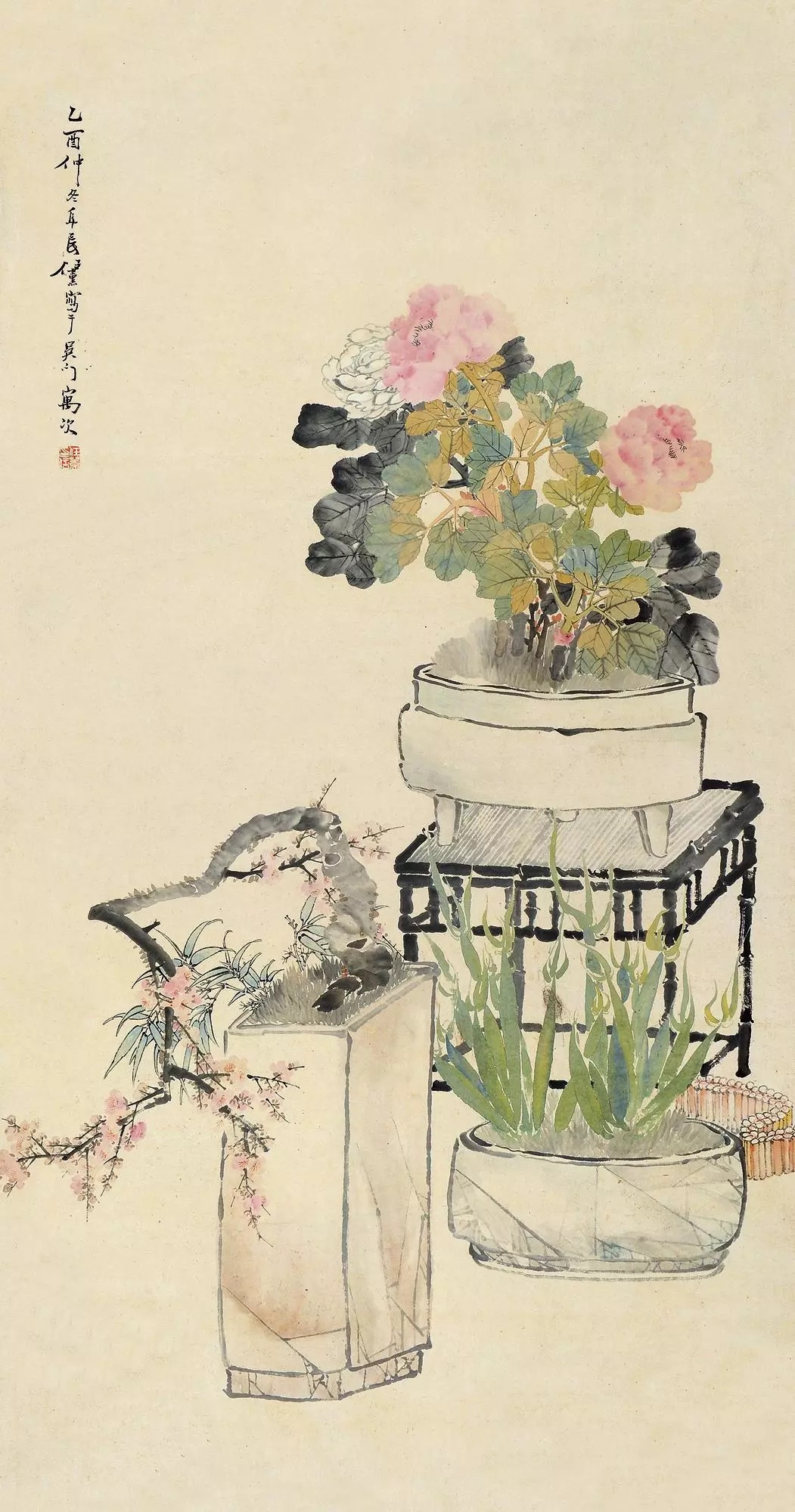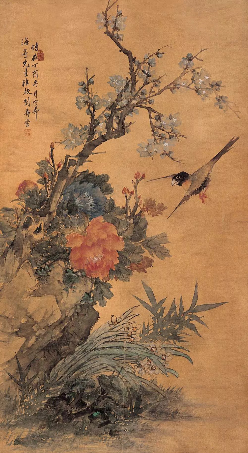 ▲[清代]劉壽萱《歲朝圖》,絹本設色,105×58cm。私人藏品。