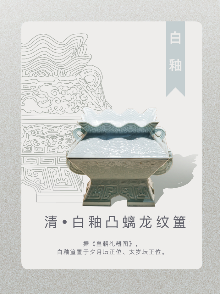 簠是古代祭祀和宴飨时盛放饭食的器具,螭龙纹是古代传统的吉祥纹饰,象征着祥瑞和权威。据《皇朝礼器图》记载,白釉簠置于夕月坛正位、太岁坛正位。