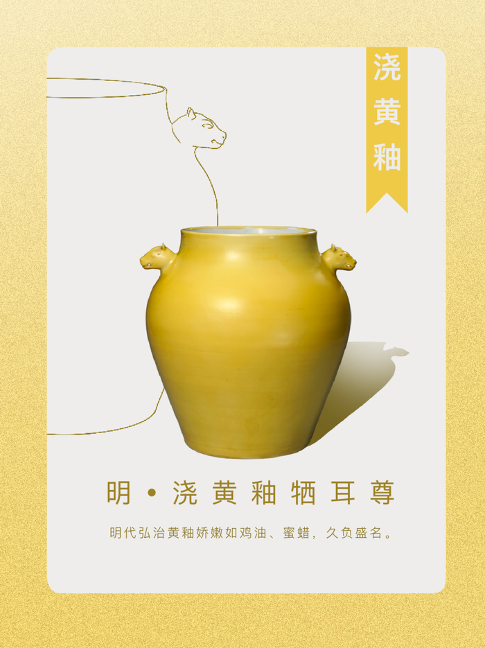 明代弘治黄釉娇嫩如鸡油、蜜蜡,久负盛名。黄釉牺耳尊是明代皇帝祭祀地坛的正位礼器,浇黄描金,是皇家之色,国之重器。