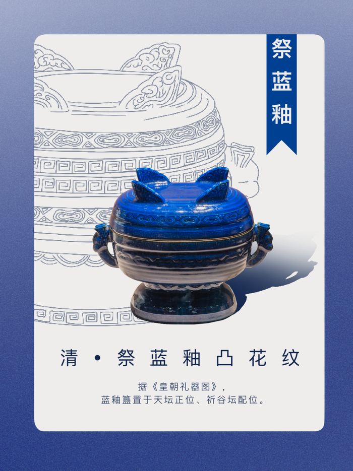 明清礼制规范了御窑不同釉色、器形的祭祀用器使用规制,不同器皿有严格的摆放位置。据《皇朝礼器图》,蓝釉簋置于天坛正位、祈谷坛配位。