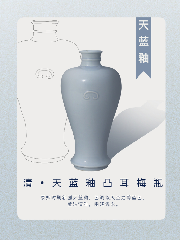 康熙时期新创天蓝釉,色调似天空之蔚蓝色,莹洁清雅,幽淡隽永。此瓶器形秀美,瓶身凸耳装饰反衬出天蓝釉的纯净之美,颇具巧思。