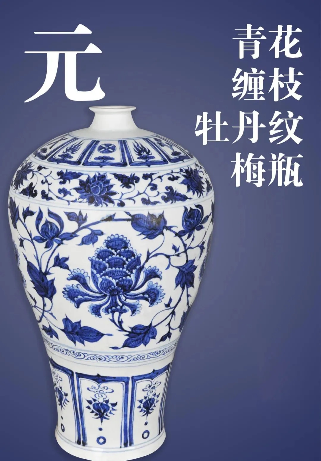 梅瓶最早出现在唐代,为盛酒用器。北宋中晚期逐步从实用器演变成艺术品。其造型溜肩、鼓腹,因口径之小仅可与梅之清风瘦骨相称,故而名曰“梅瓶”。器物纹饰层次多、繁而不乱。器身自上而下绘五层纹饰,分别是杂宝纹、缠枝莲纹、缠枝牡丹纹、卷草纹及仰莲瓣纹。元青花使用钴元素为主要发色材料,烧成后,呈色湛蓝苍翠,伴有铁锈褐色斑痕。胎体采用瓷石加高岭土的“二元配方”法,提高了烧成温度,减少制品的变形,开创了烧制大件瓷器的时代。
