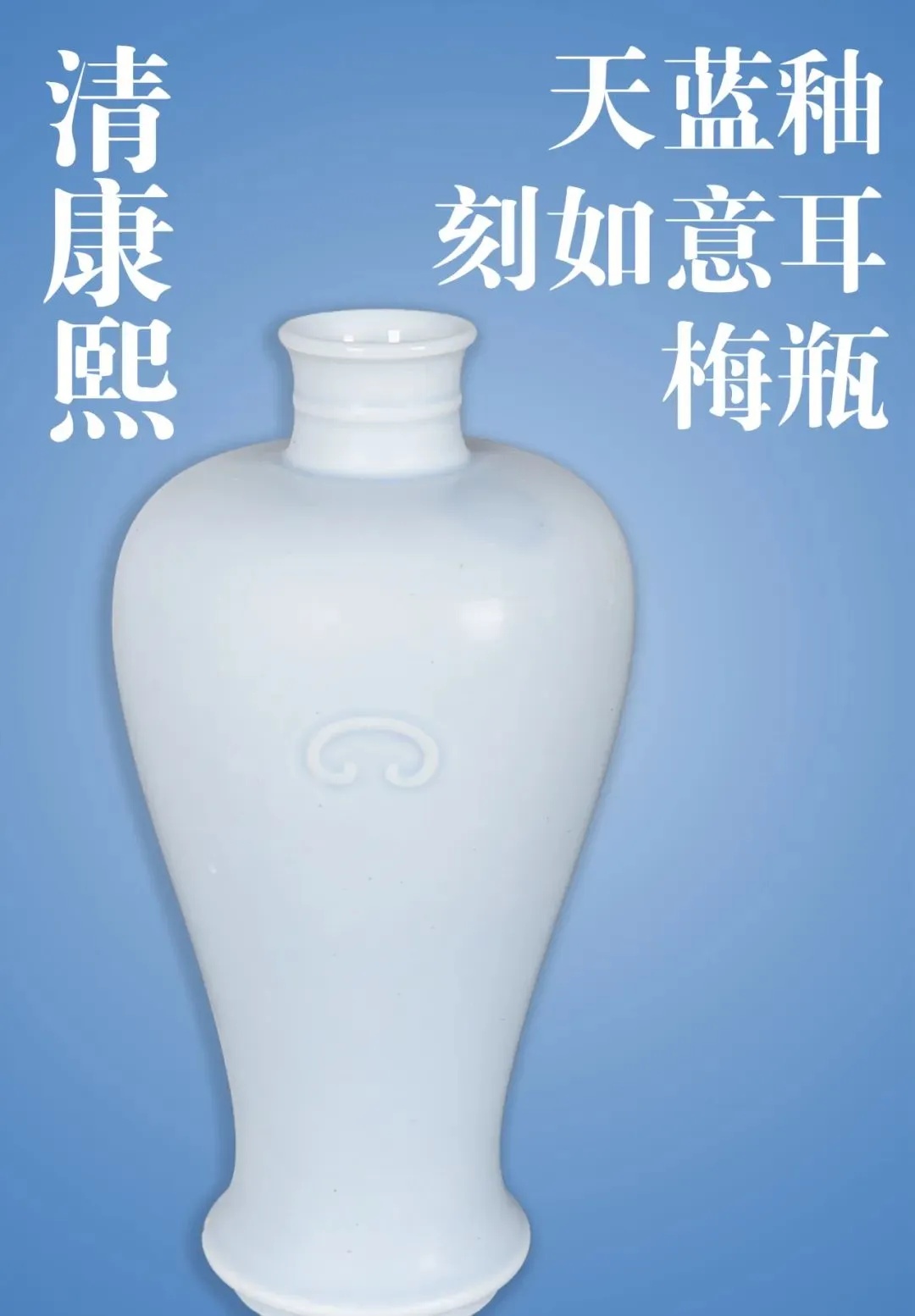 这件梅瓶整体造型简约流畅,短颈,丰肩,肩下两侧凸起“如意云”形状的装饰;通体施天蓝釉,釉质莹润,釉色淡雅素净,圈足内书写有“大清康熙年制”三行六字楷书款。
